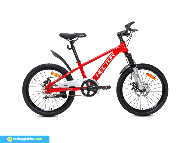 Xe đạp Hector Ares 20 inch được sơn màu đỏ và điểm nhấn trên đó là tên thương hiệu màu trắng, chắn xích và phuộc xe màu bạc làm điểm nhấn cho chiếc xe.