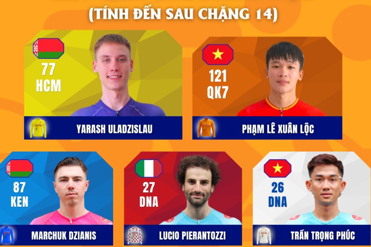 Sau chặng 14, các tay đua đã bảo vệ thành công danh hiệu, cụ thể: Yarash Uladzislau (TP. Hồ Chí Minh) giữ vững Áo vàng; Phạm Lê Xuân Lộc (Quân khu 7) tiếp tục nắm giữ Áo cam; Marchuk Dzianis (Kenda Đồng Nai) bảo vệ thành công Áo xanh; Trần Trọng Phúc (Võ Đắc Đồng Nai) vẫn giữ Áo trắng.