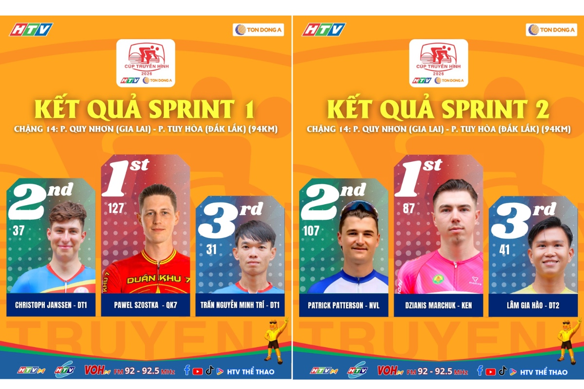 Chặng đua 14 của Cúp Truyền hình 2026 đã diễn ra vào ngày 18/4, đoàn đua sẽ di chuyển từ tượng đài Quang Trung (phường Quy Nhơn, tỉnh Gia Lai) đến tháp Nghinh Phong (phường Tuy Hòa, tỉnh Đắk Lắk) với lộ trình 94 km. Cuộc đua diễn ra đầy hấp dẫn và cú hit bất ngờ đến từ tay đua Marchuk Dzianis của đội Kenda Đồng Nai. Tại giải đua Cúp Truyền hình năm nay, anh đã liên tiếp 5 lần chạm tay vào vị trí cao nhất của chặng.