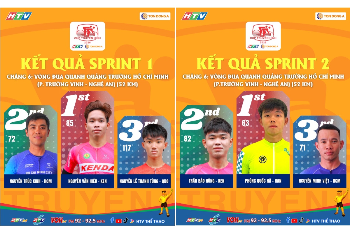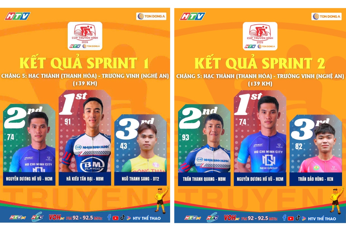 Chặng 5 Cúp truyền hình 2026 đã diễn ra vào ngày 7/4, với cự ly 139 km từ Thanh Hóa đến Nghệ An. Ngay khi xuất phát, các tay đua đã đẩy cao tốc độ giúp cuộc đua trở nên kịch tính hơn dưới cái nóng 32 độ C. Dưới sức ép của các đối thủ, tay đua Nguyễn Dương Hồ Vũ đã xuất sắc dành chiến thắng trong cả 2 điểm sprint. Cụ thể, ở chặng Sprint 1, Hồ Vũ chỉ xếp sau tay đua Hà Kiều Tấn Đại (Nhựa Bình Minh). Sang chặng sprint 2, anh đã vươn lên cán đích đầu tiên, sau đó là Trần Thanh Quang (Nhựa Bình Minh) và Trần Bảo Hùng (Kenda Đồng Nai).