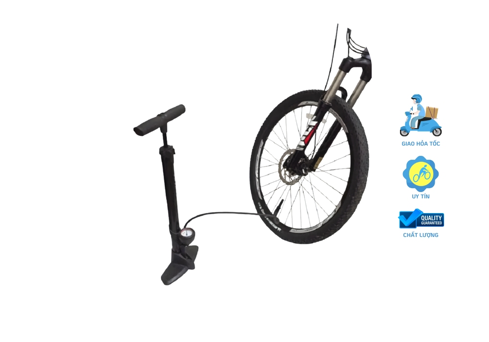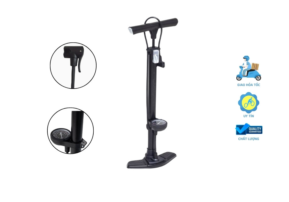 - Bơm sàn có đồng hồ đo áp suất, khả năng bơm áp lực cao tối đa 160 PSI (11 Bar)