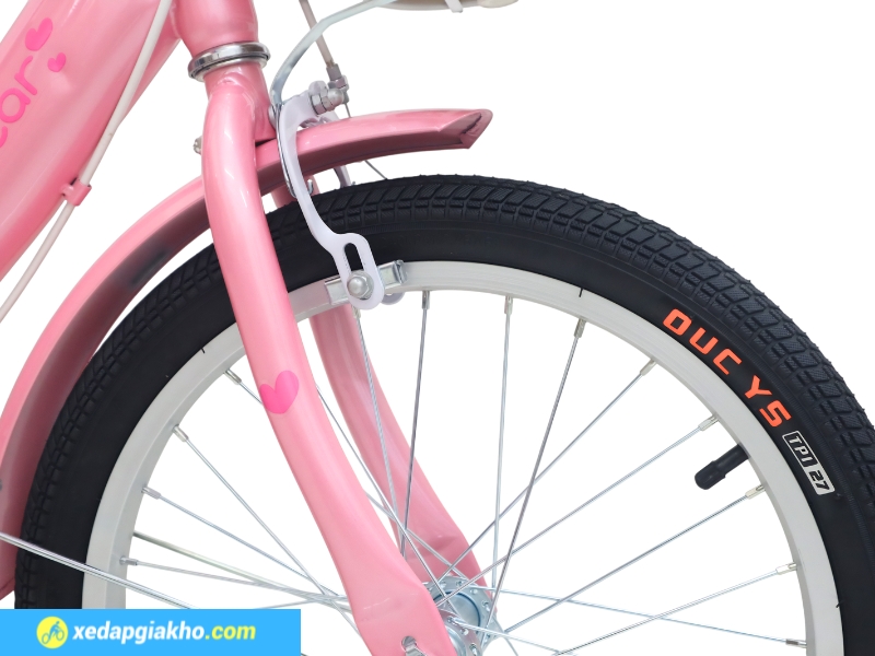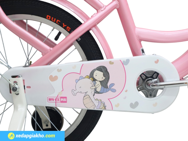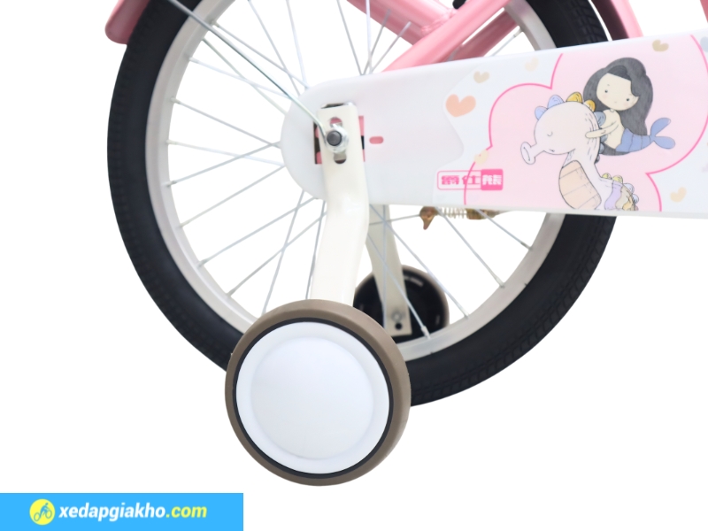 Lớp sơn này giúp xe chống trầy xước hiệu quả, hạn chế tình trạng bong tróc theo thời gian. Đồng thời, tăng độ bền khi sử dụng ngoài trời. Ngoài ra, trên khung xe đạp bé gái có dán tem thương hiệu, tạo điểm nhấn tinh tế và đảm bảo nguồn gốc chính hãng.