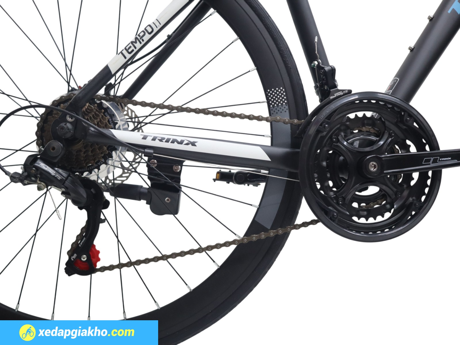 Cấu hình xe đua Trinx Tempo 1.1 sử dụng groupset chất lượng Shimano. Với thiết kế tay đề kéo Shimano gồm: 3 đĩa trước và 7 líp sau, giúp người lái linh hoạt tốc độ di chuyển.