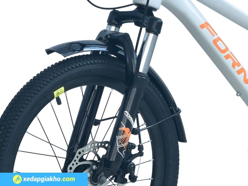 Phuộc nhún lò xo được trang bị phía trước của xe Fornix HS20 20 inch. Bộ phuộc này hỗ trợ hấp thụ các rung động từ mặt đường, mang lại cảm giác êm ái hơn khi bé đạp xe qua các đoạn đường gồ ghề nhẹ hay bề mặt không bằng phẳng.
