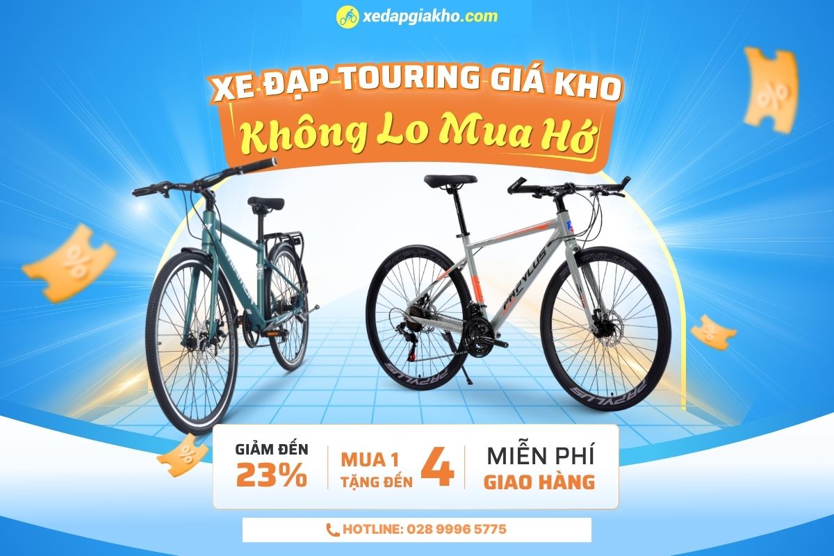 Xe Đạp Giá Kho ưu đãi khách hàng bằng chương trình khuyến mãi xe đạp touring, cơ hội hấp dẫn dành cho quý khách hàng đang có ý định tìm kiếm một chiếc xe đạp touring với giá tốt, ưu đãi đi kèm vô cùng giá trị.