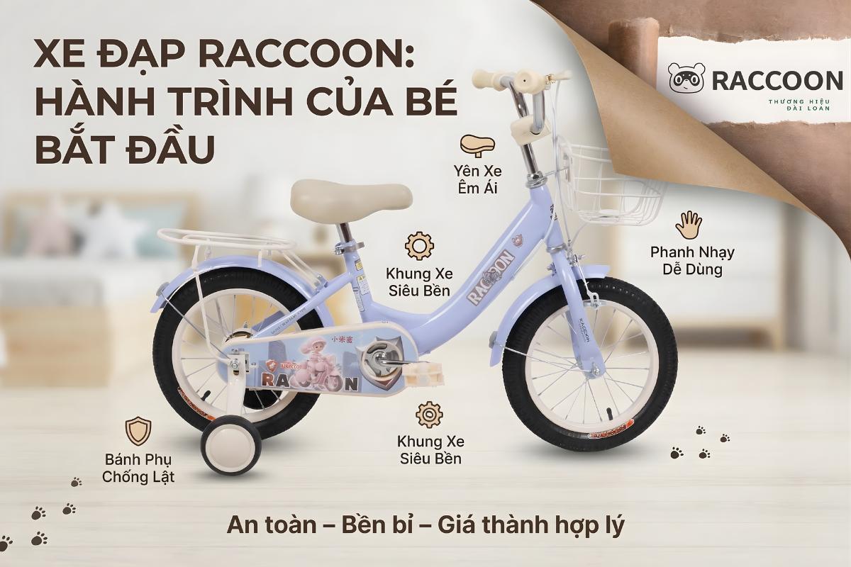 Thương hiệu xe đạp Raccoon đến từ Đài Loan, thành lập từ năm 1993. Ngay từ những ngày đầu, Raccoon đã định hướng phát triển các dòng xe đạp dành riêng cho trẻ em, tập trung vào yếu tố an toàn, độ bền và phù hợp với thể trạng trẻ nhỏ châu Á.